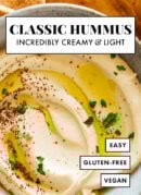 Learn how to make the best homemade hummus! Itโs creamy, dreamy and light. This hummus recipe is easy to makeโno peeling chickpeas or overnight soak required. Recipe yields about 2 cups.