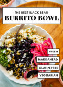 This homemade black bean burrito bowl recipe features cilantro-lime rice, tender black beans, pickled onions and fresh cilantro pesto! This healthy bowl makes great leftovers, too. Itโ€™s vegetarian (easily vegan) and gluten free. Recipe yields 4 hearty burrito bowls.
