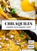 This delicious Mexican chilaquiles verdes recipe is made lighter with freshly baked tortilla chips! Add salsa verde, fried eggs (optional), and fresh garnishes for an epic breakfast, brunch or dinner. Recipe yields 4 servings.