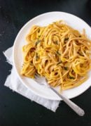 Spiced and creamy (yet cream-less) butternut squash sauce tossed with whole grain linguine. Top with fried sage for a healthy, comforting main dish. Serve with salad or roasted vegetables to further lighten up the meal. Recipe yields 4 large servings.