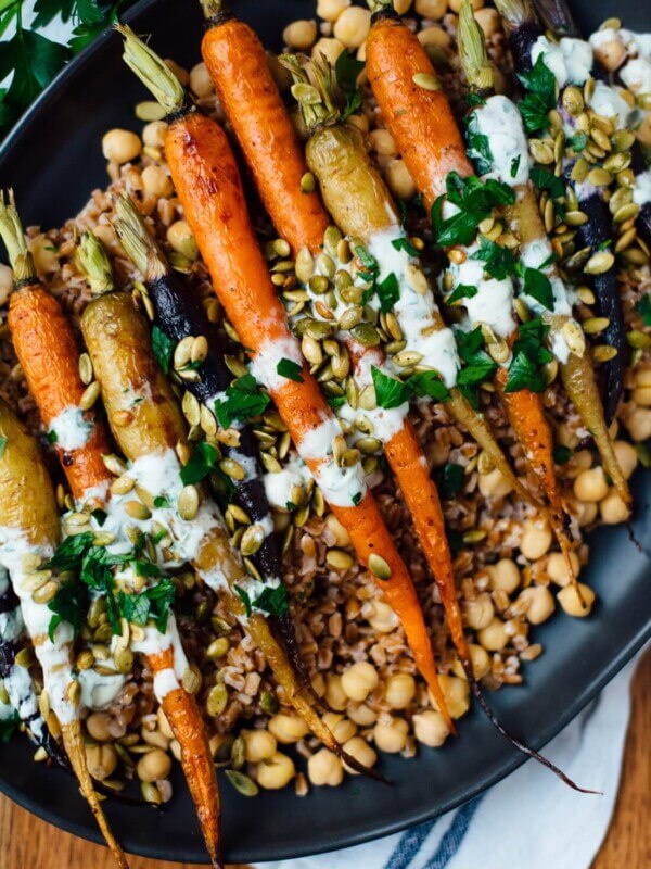 Roasted Carrots with Farro, Chickpeas & Herbed Creme Fraiche